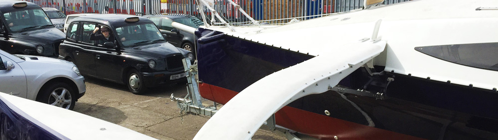 I'm building a boat in South London - it's a Farrier F-33 folding trimaran (here's the designers website). It's 10m long, 7m wide when unfolded and when done will weigh about 1500kg. It will be able to cross oceans, if I can ever get through the traffic.